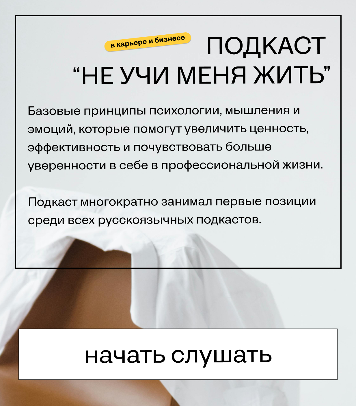 Подкаст "Не учи меня жить" десятки раз занимал 1-е место в России в рейтинге Apple Podcasts и стабильно входит в топ-0,5% подкастов по всему миру.
